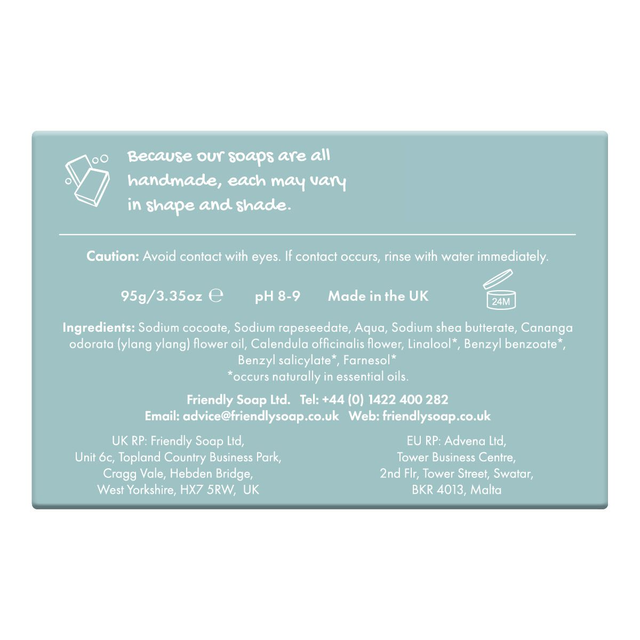 Ingredients: Sodium cocoate, Sodium rapeseedate, Aqua, Sodium shea butterate, Cananga odorata (ylang ylang) flower oil, Calendula officinalis flower, Linalool, Benzyl benzoate, Benzyl salicylate, Farnesol.